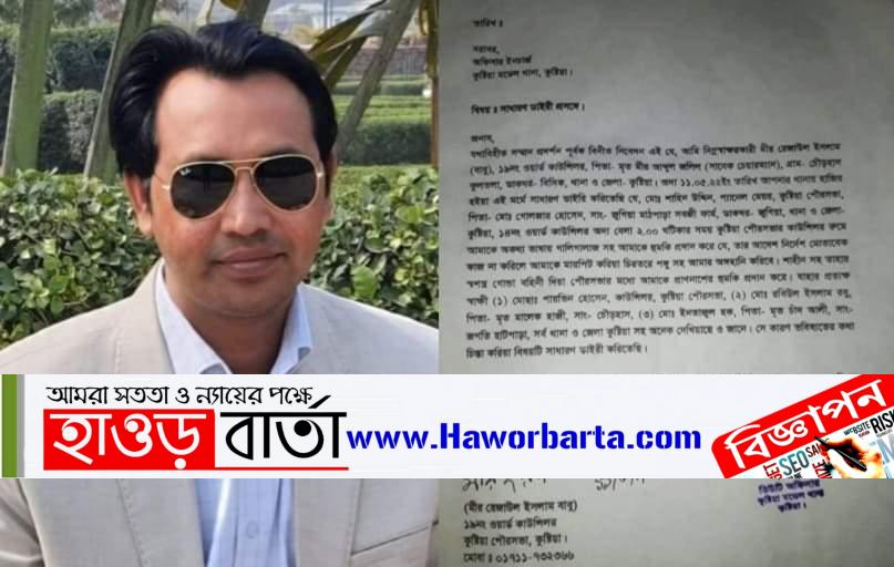 কুষ্টিয়ার পৌরসভার ১৯ নং ওয়ার্ড কাউন্সিলর মীর রেজাউল ইসলাম বাবুকে পৌরসভার মধ্যে হত্যার হুমকি দিলেন ১৪ নং ওয়ার্ড কাউন্সিলর ও প্যানেল মেয়র শাহিন উদ্দিন। ঘটনাটি ঘটেছে গত ১১ তারিখ দুপুর ২ ঘটিকার সময়। এ বিষয়ে ওয়ার্ড কাউন্সিলর রেজাউল ইসলাম বাবু রাত ১১ ঘটিকার সময় কুষ্টিয়া মডেল থানায় একটি সাধারণ ডায়েরি করেন যাহার নং ৬৩৬ তারিখ ১১/০৫/২০২২।