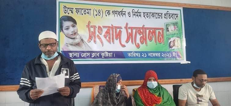 কুষ্টিয়ার মিরপুর বর্ডার গার্ড পাবলিক স্কুল এন্ড কলেজের নবম শ্রেণীর ছাত্রী উম্মে ফাতেমার (১৪) গণধর্ষণ ও নৃশংস হত্যাকান্ডের সুষ্ঠু তদন্ত ও বিচারের দাবিতে সংবাদ সম্মেলন করেছেন নিহতের পরিবার। সংবাদ সম্মেলন থেকে চাঞ্চল্যকর ও লোমহর্ষক এই হত্যাকান্ডের ঘটনায় পুলিশের ভূমিকা নিয়ে অসন্তোষ প্রকাশ করে পরিবারের পক্ষ থেকে বলা হয় একজন আসামির পক্ষে কোনভাবেই গণধর্ষণ শেষে এমন নির্মম ও নৃশংস হত্যাকান্ড ঘটানো সম্ভব নয়। পরিবারের অভিযোগ ময়নাতদন্ত রিপোর্টে গণধর্ষণের আলামত মিললেও পুলিশ কিছুতেই তাদের কথা আমলে নিচ্ছে না। রোববার বেলা সাড়ে ১০ টায় কুষ্টিয়া প্রেসক্লাবের এম এ রাজ্জাক মিলনায়তনে এক সংবাদ সম্মেলনে পরিবারের পক্ষ থেকে এসব অভিযোগ তোলা হয়। সংবাদ সম্মেলনে লিখিত বক্তব্য পাঠ করেন স্কুল ছাত্রী নিহত উম্মে ফাতেমার পিতা খন্দকার সাইফুল ইসলাম। এ সময় স্কুল ছাত্রী নিহত ফাতেমার মা হালিমা খাতুন, দুই চাচা খন্দকার সোহল রানা ও খন্দকার মাহাফুজুর রহমান ও চাচী মোমেনা আফরোজ উপস্থিত ছিলেন।