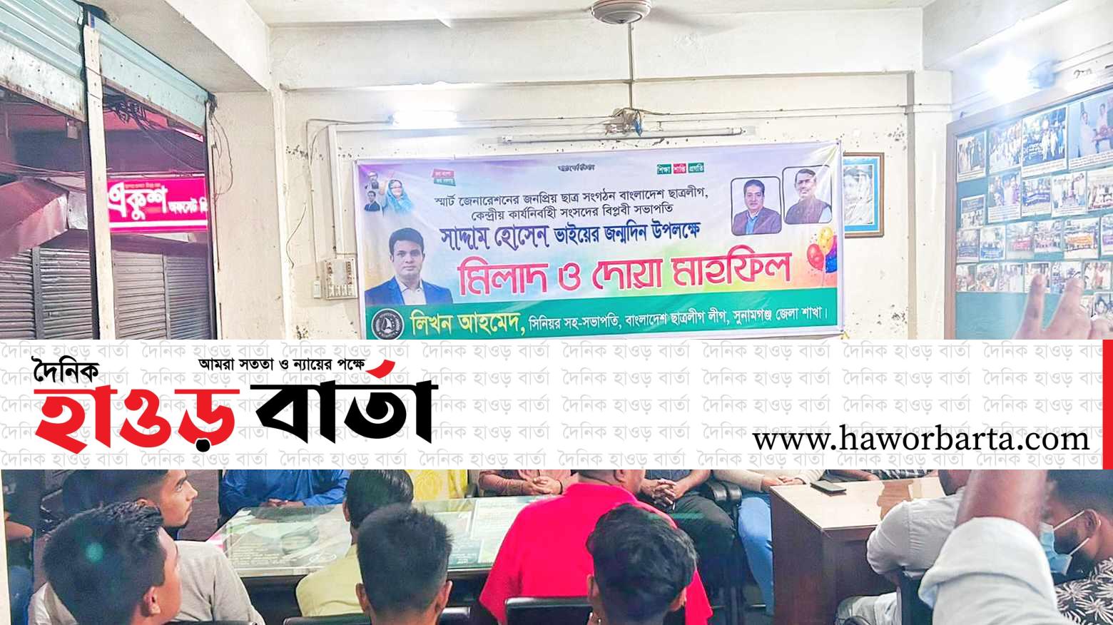 বাংলাদেশ ছাত্রলীগ কেন্দ্রীয় কার্যনির্বাহী সংসদের বিপ্লবী সভাপতি ‘সাদ্দাম হোসেনের’ জন্মদিন উপলক্ষে সুনামগঞ্জ জেলা ছাত্রলীগের সিনিয়র সহ-সভাপতি, লিখন আহমেদের নেতৃত্বে মিলাদ ও দোয়া মাহফিলের আয়োজন করা হয়। শুক্রবার (১০ নভেম্বর) বিকালে সুনামগঞ্জ জেলা আওয়ামীলীগের রমিজ বিপনী দলীয় কার্যালয়ে অনুষ্টান পালিত হয়।এ সময় উপস্থিত ছিলেন,সহ-সভাপতি কাওছার আহমেদ, সহ-সভাপতি লায়েছ আহমেদ রাবিন, উপ-দপ্তর সম্পাদক সাদেক আহমদ,জেলা ছাত্রলীগ নেতা রাহুল চৌধুরী,মুতাছির হাসান,তাওহিদআহমেদ,আকেপ,নাবিল,রাজিব,আদনা,দোহা, প্রমুখ।