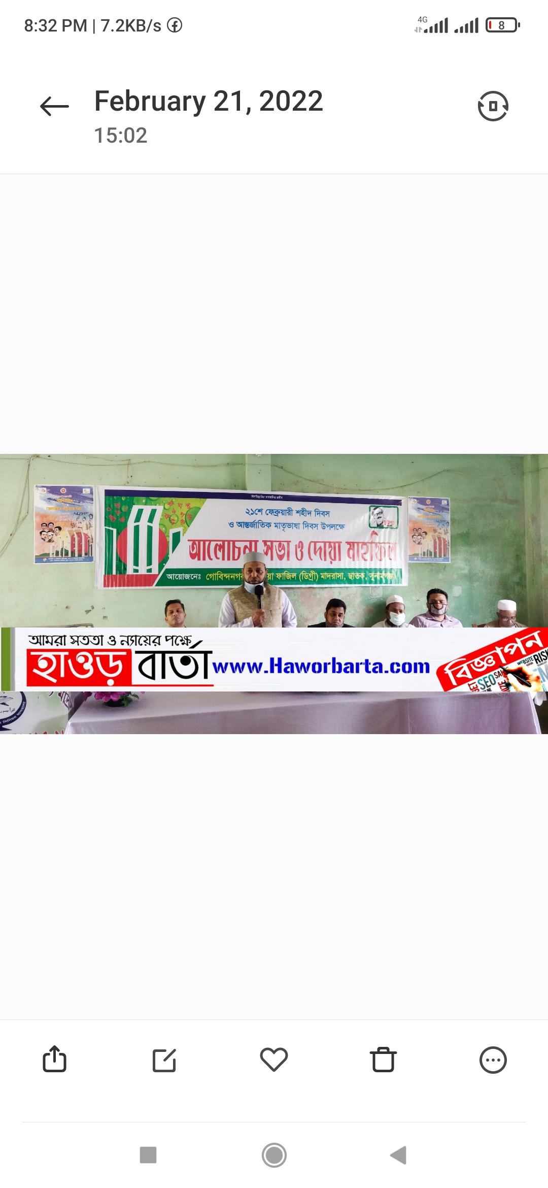 নিজেস্ব প্রতিবেদনঃ- ২১শে ফেব্রুয়ারি শহিদ দিবস ও আন্তর্জাতিক মাতৃভাষা দিবস উদযাপন উপলক্ষে গোবিন্দনগর ফজলিয়া ফাজিল (ডিগ্রী) মাদ্রাসায় আলোচনা সভা ও দোয়া মাহফিল অনুষ্ঠিত।