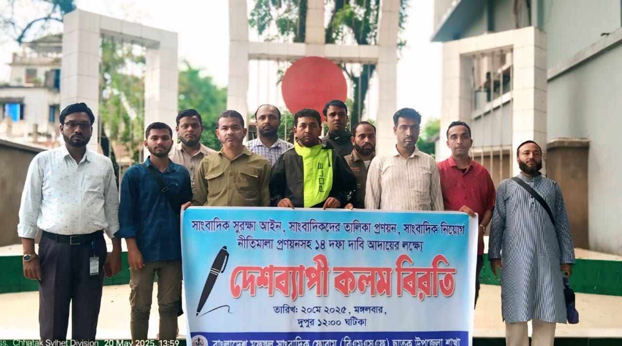 স্বাধীনতার ৫৪বছরেও সাংবাদিকদের পেশাগত অধিকার প্রতিষ্ঠিত হয়নি ১৪ দফা দাবিতে ছাতকে সাংবাদিকদের কলমবিরতি।