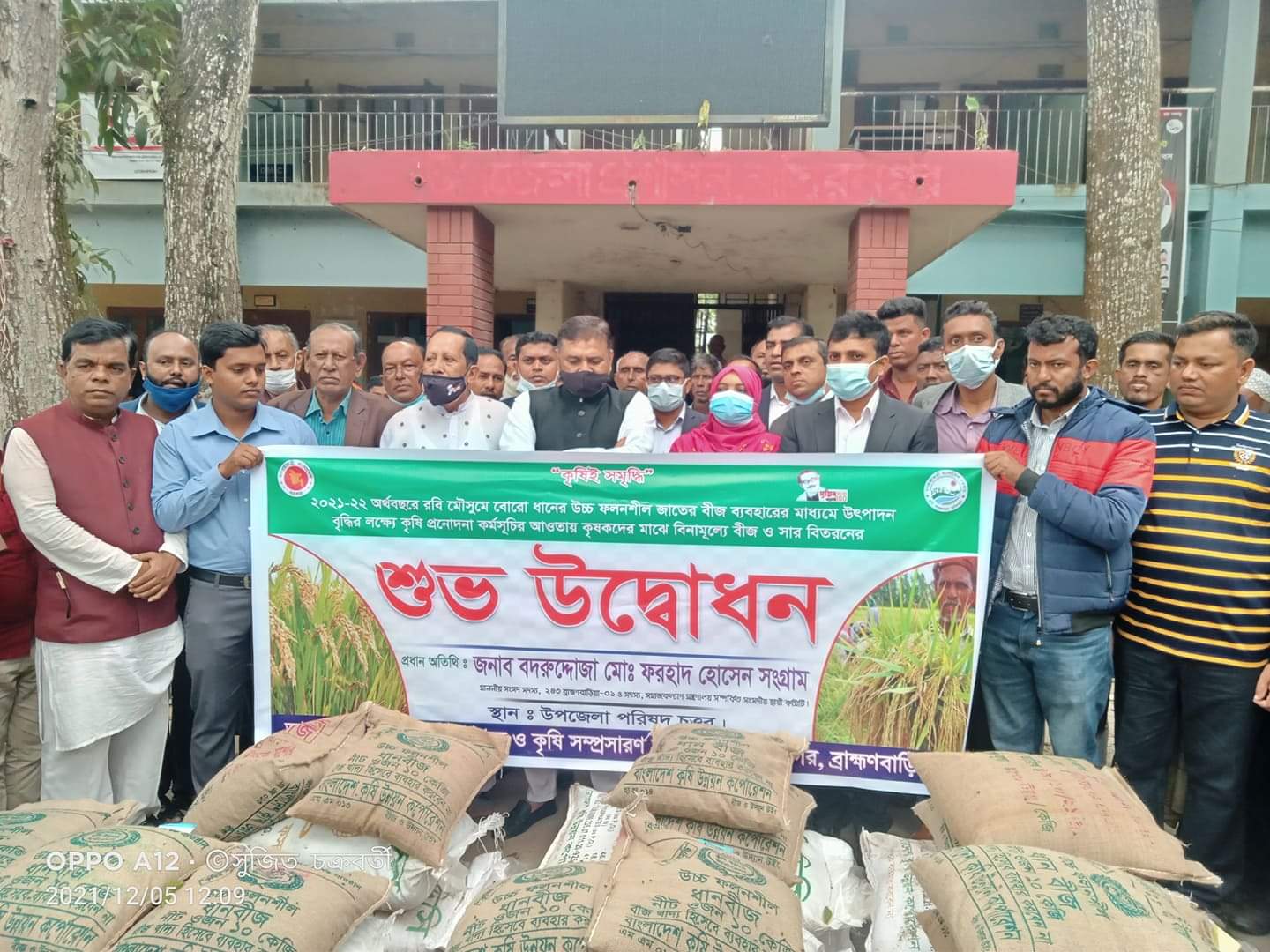 ৫ ডিসেম্বর ২০২১ রবিবার উপজেলা পরিষদ চত্বরে কৃষি সম্প্রসারণ অধিদপ্তর এর উদ্যোগে নাসিরনগর উপজেলায় কৃষকদের মাঝে বিনামূল্যে ধান বীজ ও সার বিতরণের শুভ উদ্বোধন করেন, ২৪৩ ব্রাহ্মণবাড়িয়া-১ ( সাংসদ) সমাজ কল্যাণ মন্ত্রণালয় সম্পর্কিত সংসদীয় স্থায়ী কমিটির সদস্য বদরুদ্দোজা মোহাম্মদ ফরহাদ হোসেন সংগ্রাম। এ সময় উপস্থিত ছিলেন, উপজেলা পরিষদ চেয়ারম্যান ও উপজেলা আওয়ামী লীগের সভাপতি রাফি উদ্দিন আহম্মদ, উপজেলা নির্বাহী কর্মকর্তা হালিমা খাতুন,উপজেলা কৃষি কর্মকর্তা আবু সাঈদ তারেক, প্রেস ক্লাব সভাপতি সুজিত কুমার চক্রবর্তী,উপজেলা আওয়ামী লীগের সহ সভাপতি মোঃ জিতু মিয়া, প্রচার সম্পাদক মোঃ লতিফ হোসেন, সাংস্কৃতিক সম্পাদক অরুণ ভট্টাচার্য, সাবেক যুবলীগের সভাপতি অঞ্জন কুমার দেব,স্বাস্থ্য ও জনসংখ্যা সম্পাদক বশীর আল হেলাল, যুবলীগের আহবায়ক মোঃ রায়হান আলী ভূইয়া, স্বেচ্ছাসেবক লীগের যুগ্ম আহবায়ক নির্মল চন্দ্র চৌধুরী, ছাত্রলীগের আহবায়ক মোঃ নাছির উদ্দীন রানা, উপজেলা আওয়ামী লীগ, যুবলীগ, স্বেচ্ছাসেবক লীগ, ছাত্রলীগের নেতৃবৃন্দ ,সাংবাদিক, কৃষি অফিসের কর্মকর্তা/ কর্মচারী, কৃষাণ/কৃষাণীসহ এলাকার গন্যমান্য ব্যক্তিগণ। উল্লেখ্য, নাসিরনগর উপজেলায় ২০০০ (দুই হাজার)কৃষকদের মাঝে বিনামূল্যে উন্নত জাতের হাইব্রিড ধান বীজ ও সার বিতরণ করা হয়েছে।