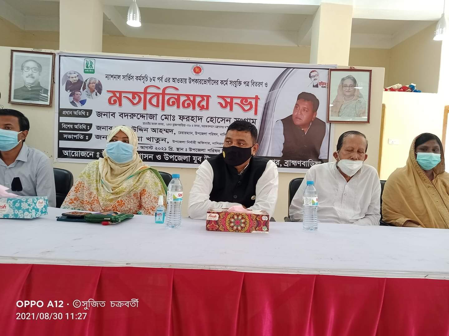 আজ ৩০ আগস্ট সোমবার সকালে উপজেলা মিলনায়তনে উপজেলা প্রশাসন ও যুব উন্নয়ন অধিদপ্তর এঁর উদ্যোগে উপজেলা নির্বাহী কর্মকর্তা হালিমা খাতুনের সভাপতিত্বে ন্যাশনাল সার্ভিসে কর্মে সংযুক্তি পত্র বিতরণ অনুষ্ঠানে প্রধান অতিথি ছিলেন, ২৪৩ ব্রাহ্মণবাড়িয়া -১ সংসদ সদস্য, সমাজ কল্যাণ মন্ত্রণালয় সম্পর্কিত সংসদীয় স্থায়ী কমিটির সদস্য বদরুদ্দোজা মোহাম্মদ ফরহাদ হোসেন সংগ্রাম। বিশেষ অতিথি ছিলেন, উপজেলা পরিষদ চেয়ারম্যান রাফি উদ্দিন আহম্মদ, উপজেলা সহকারি কমিশনার ভূমি মোঃ মেহেদী হাসান খান শাওন, মহিলা ভাইস চেয়ারম্যান রুবিনা আক্তার, ভাইস চেয়ারম্যান সৈয়দ ফজলে ইয়াজ আল হোসাইন। স্বাগত বক্তব্য রাখেন, উপজেলা যুব উন্নয়ন কর্মকর্তা মোঃ শফিকুল ইসলাম। সহকারী যুব উন্নয়ন কর্মকর্তা মোঃ ইব্রাহিম ভূইয়া এঁর সঞ্চালনায় বক্তব্য রাখেন, ব্যাংক এশিয়া ম্যানেজার সাইফ আহাম্মদ, সাদ্দাম হোসেন, সানজানা আহমেদ পলি, তানভির হাসান প্রমুখ। মতবিনিময় সভার শেষে উপজেলার ১৩ টি ইউনিয়ন হতে ন্যাশনাল সার্ভিসে উপকারভোগী ৪৩৪ জনের হাতে কর্মে সংযুক্তি পত্র প্রদান করা হয়। উক্ত অনুষ্ঠানে উপস্থিত ছিলেন, বীর মুক্তিযোদ্ধা, উপজেলা আওয়ামী লীগ, যুবলীগ, স্বেচ্ছাসেবক লীগ, ছাত্রলীগের নেতৃবৃন্দ, সাংবাদিক, ইউনিয়ন পরিষদ চেয়ারম্যান, বিভিন্ন দপ্তরের কর্মকর্তা, ন্যাশনাল সার্ভিসের উপকারভোগীসহ গন্যমান্য ব্যক্তিগণ।
