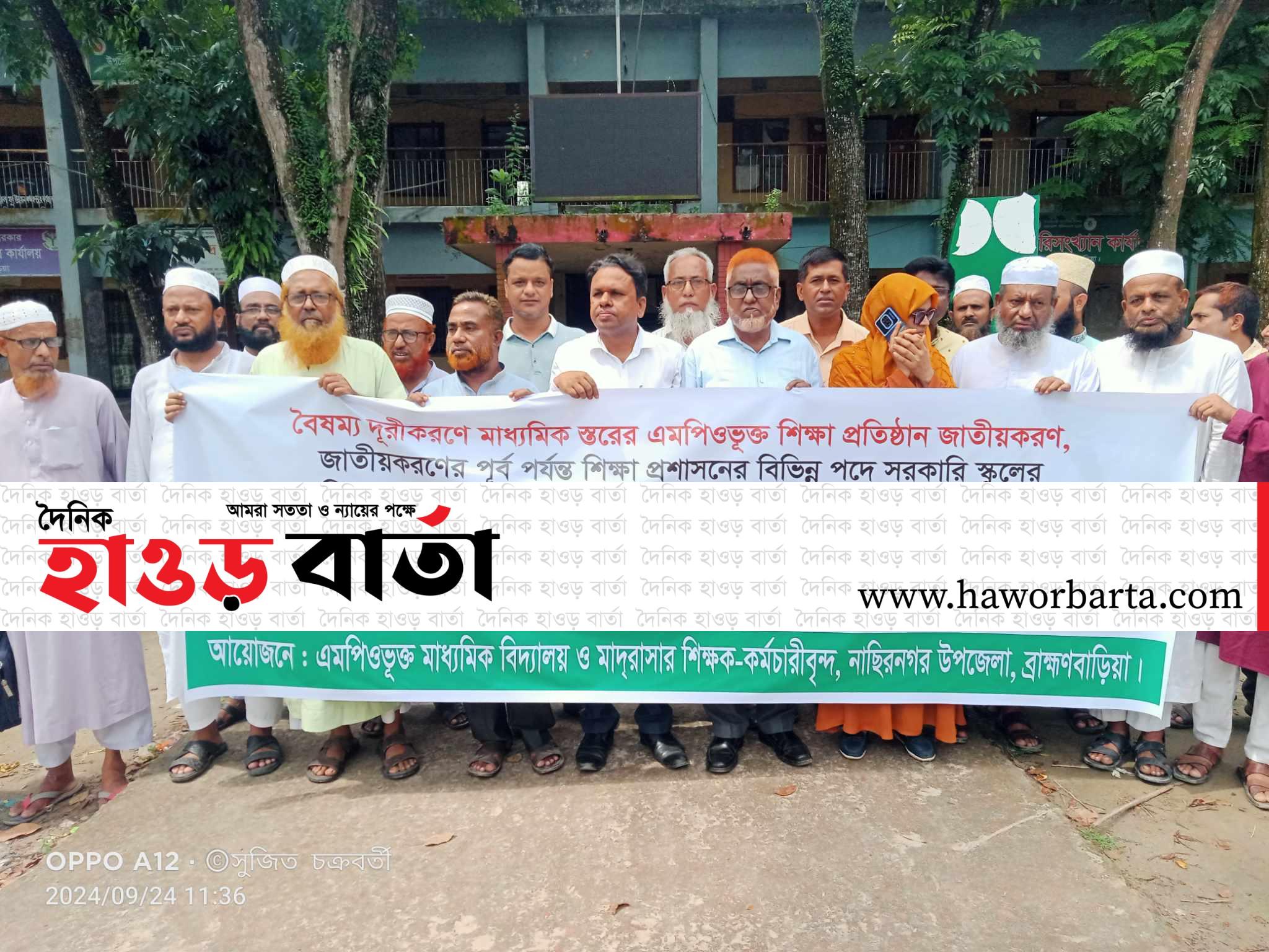 মঙ্গলবার ২৪ সেপ্টেম্বর ২০২৪ খ্রিঃ সারা দেশের ন্যায় নাসিরনগর উপজেলায় বৈষম্য দূরীকরণ মাধ্যমিক স্তরের বেসরকারি শিক্ষা প্রতিষ্ঠান জাতীয়করণ, জাতীয়করণের পূর্ব পর্যন্ত শিক্ষা প্রশাসনের বিভিন্ন পদে সরকারি স্কুলের শিক্ষকদের পদায়ন বন্ধ রাখা ও শিক্ষা সংস্কার কমিশন গঠনের দাবীতে মানববন্ধন ও শিক্ষা উপদেষ্টা বরাবরে স্মারক লিপি প্রদান করা হয়। উপজেলা চত্বরে সকালে এমপিভূক্ত মাধ্যমিক বিদ্যালয় ও মাদ্রাসার শিক্ষক, কর্মচারীদের আয়োজনে মানববন্ধনে বক্তব্য রাখেন, দাঁতমন্ডল এরফানিয়া আলিম মাদ্রাসার অধ্যক্ষ মাওলানা ইলিয়াস মিয়া, কুন্ডা উচ্চা বিদ্যালয়ের প্রধান শিক্ষক মোঃ শহীদুল হক, খান্দুরা মাদ্রাসার সুপার মাওলানা জহিরুল ইসলাম, গুনিয়াউক উচ্চ বিদ্যালয়ের প্রধান শিক্ষক মোঃ সিজানুর রহমান প্রমুখ। মানববন্ধনের শেষে উপজেলা নির্বাহী কর্মকর্তা নিকট স্মারকলিপি প্রদান কর হয়।