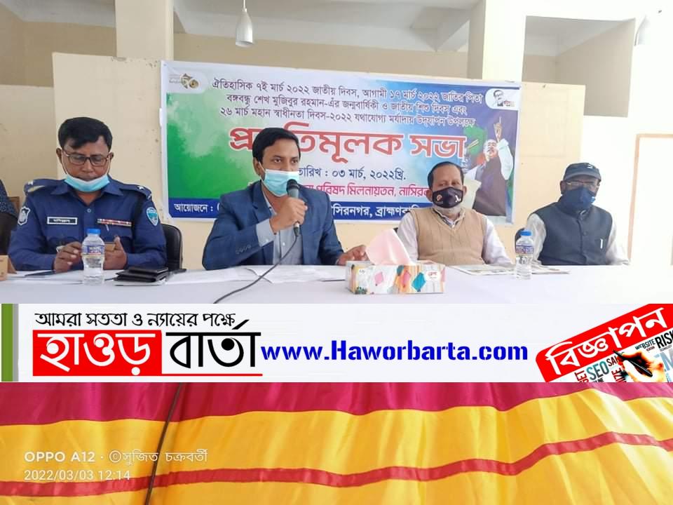 নাসিরনগর ( ব্রাহ্মণবাড়িয়া) প্রতিনিধিঃ জেলার নাসিরনগর উপজেলায় ঐতিহাসিক ৭ই মার্চ, ১৭ মার্চ, জাতির পিতা বঙ্গবন্ধু শেখ মুজিবুর রহমানের জন্মবার্ষিকী, জাতীয় শিশু দিবস এবং ২৬ মার্চ মহান স্বাধীনতা জাতীয় দিবস, ২০২২ যথাযোগ্য মর্যাদায় উদযাপন উপলক্ষে জাতীয় কর্মসূচির আদলে কর্মসূচি প্রণয়ন ও বাস্তবায়নের লক্ষ্যে প্রস্তুতিমূলক সভা অনুষ্ঠিত হয়।