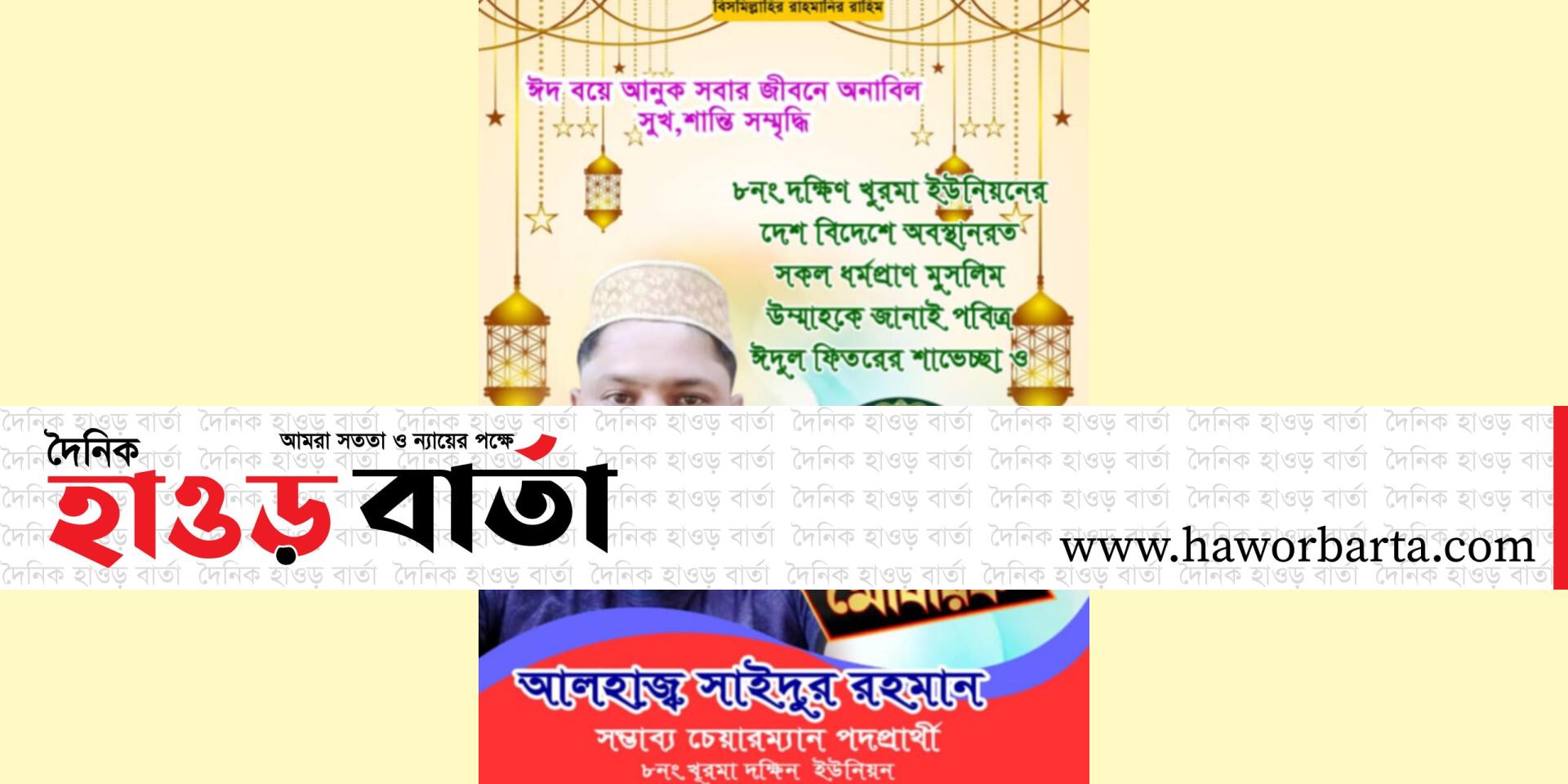 নিজেস্ব প্রতিবেদক: পবিত্র ঈদুল ফিতর উপলক্ষে ছাতক উপজেলার খুরমা দক্ষিণ ইউনিয়নসহ দেশবাসীকে শুভেচ্ছা ও মোবারকবাদ জানিয়েছেন ধারণ আঞ্চলিক শাখা শ্রমিকদলের সাংগঠনিক সম্পাদক, খুরমা দক্ষিণ ইউনিয়ন পরিষদের চেয়ারম্যান পদপ্রার্থী সৈয়দুর রহমান।
