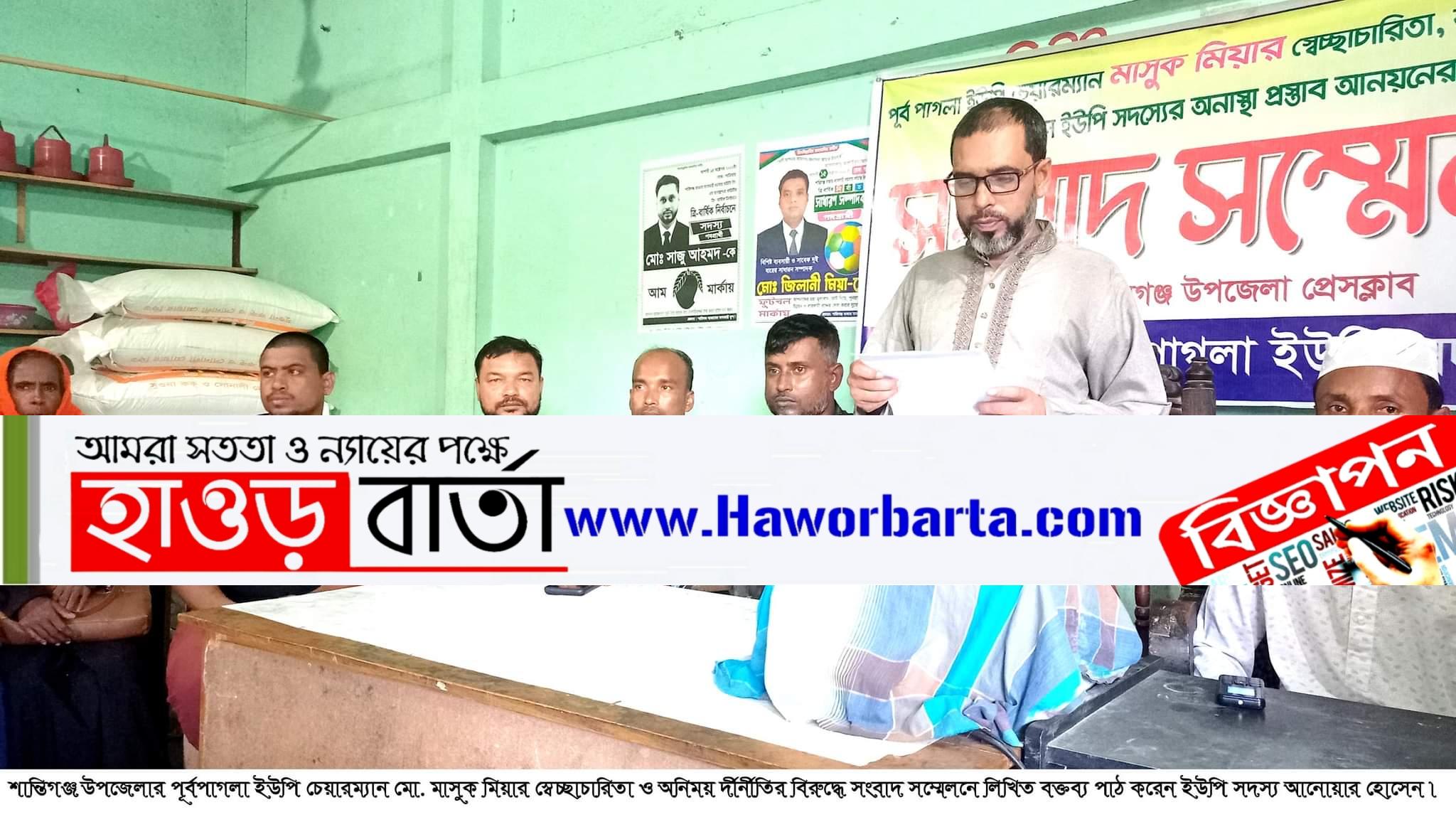 সুনামগঞ্জের শান্তিগঞ্জ উপজেলার পূর্বপাগলা ইউনিযন পরিষদের ১১জন ইউপি সদস্য ও সদস্যরা মিলে পরিষদের চেয়ারম্যান মো. মাসুক মিয়ার স্বেচ্ছাচারিতা, লাইসেন্সকৃত পিস্তল দেখিয়ে ভয়ভীতি প্রদর্শন ও অনিয়ম র্দূনীতির বিরুদ্ধে পরিষদের ১১ জন ইউপি সদস্য ও সদস্যাদের সংবাদ সম্মেলন ও উপজেলা নির্বাহী আফিসার বরাবরে লিখিত অভিযোগ দায়ের করা হয়েছে।