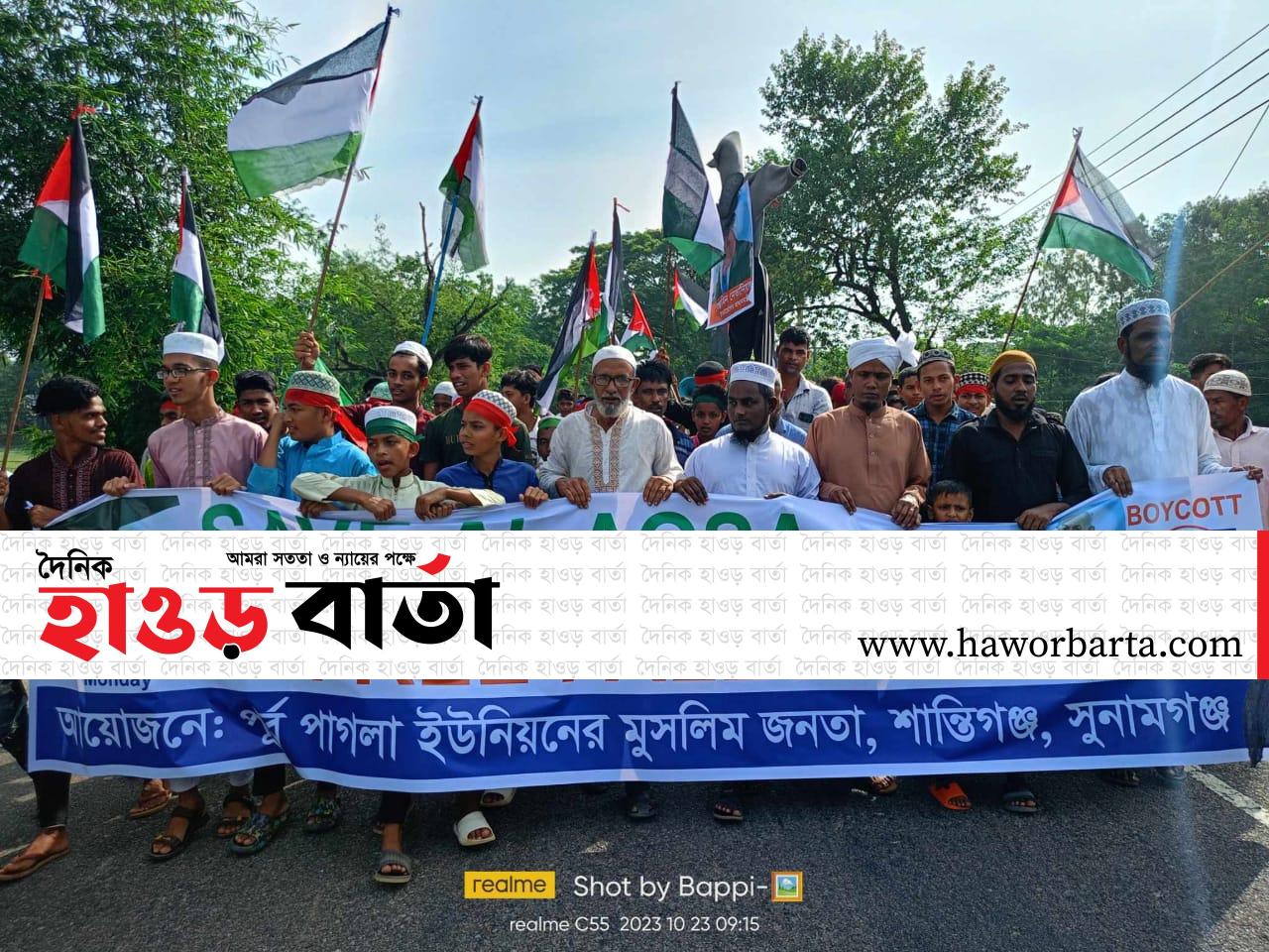 ফিলিস্তিনে সন্ত্রাসবাদী ইসরায়েলের হামলার প্রতিবাদে শান্তিগঞ্জে বিক্ষোভ মিছিল।