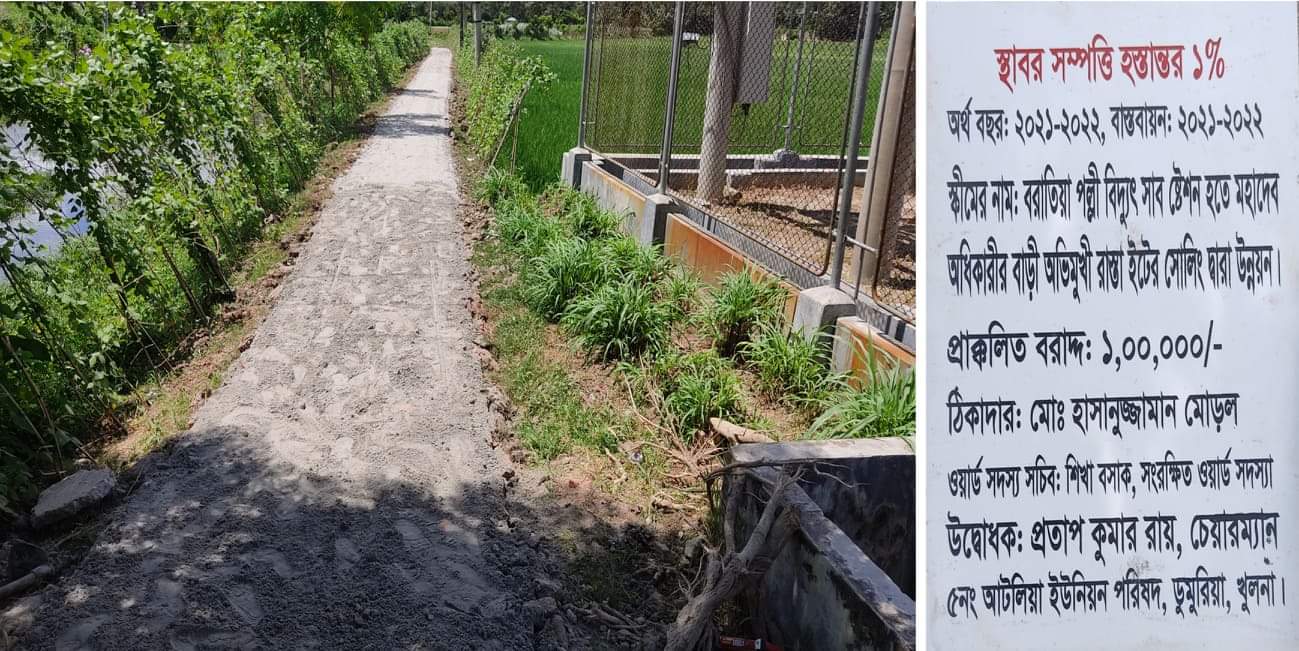 খুলনা ডুমুরিয়ার ৫ নম্বর আটলিয়া ইউনিয়নের অধীনস্থ বরাতিয়া গ্রাম (৮নং ওয়ার্ড) এর উন্নয়ন ছিল অনেক ধীর গতিসম্পন্ন । উক্ত গ্রামের পল্লী বিদ্যুৎ সাব স্টেশন হতে মহাদেব অধিকারীর বাড়ি অভিমুখী মাটির রাস্তা দিয়ে প্রতিনিয়ত শত মানুষের চলাচল। তবে বর্ষার সময় তাদের অনেক ভোগান্তিতে পড়তে হয়। একটানা কিছুদিন বৃষ্টি হলেই রাস্তাটি চলাচলের অনুপযোগী হয়ে পড়ে। মানুষের এই ভোগান্তির মুক্তির প্রেক্ষিতে আজ সোমবার (০৯ সেপ্টেম্বর) উক্ত রাস্তাটি ইটের সলিং দ্বারা উন্নয়ন করা হয়।