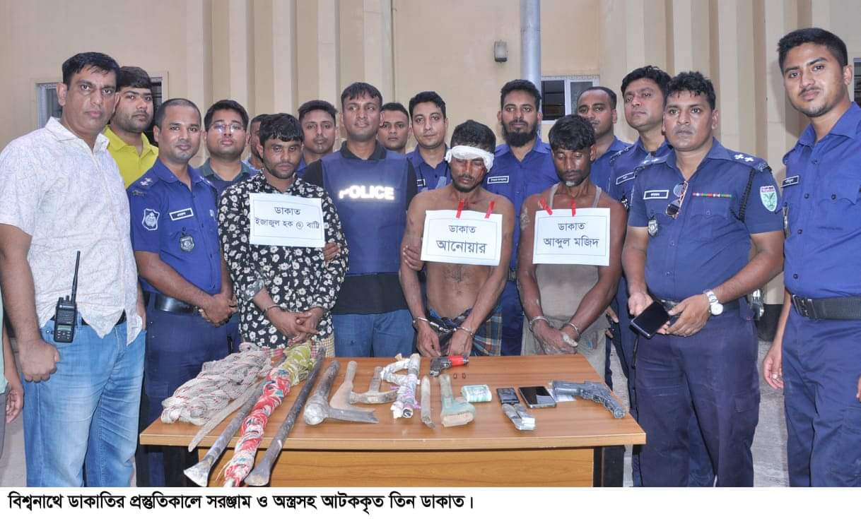 বিশ্বনাথ প্রতিনিধি : সিলেটের বিশ্বনাথে ডাকাতির সরঞ্জাম ও অস্ত্রসহ ৩ ডাকাতকে আটক করেছে পুলিশ। শনিবার (৩০ অক্টোবর) বিকেল ৩টার দিকে উপজেলার খাজাঞ্চী ইউনিয়নের মদনপুর গ্রামে অভিযান চালিয়ে স্থানীয় এলাকাবাসীর সহযোগিতায় তাদেরকে আটক করে থানা পুলিশ।