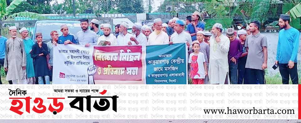 স্টাফ রিপোর্টার: সিলেট সদর উপজেলার ওসমানী আন্তর্জাতিক বিমানবন্দর কাকুয়ারপাড় এলাকায় কাকুয়ারপাড় কেন্দ্রীয় জামে মসজিদ ও এলাকাবাসীর উদ্যোগে মহানবী হযরত মুহাম্মদ (সা.)-কে নিয়ে ভারতীয় হিন্দু ধর্মের পুরোহিত রাম গিরি মহারাজের কটূক্তির প্রতিবাদে বিক্ষোভ মিছিল ও সমাবেশ অনুষ্ঠিত হয়।