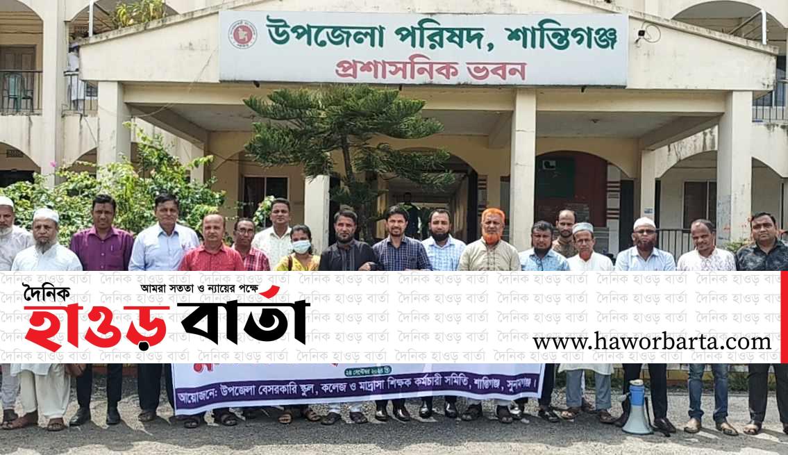 মঙ্গলবার(২৪ সেপ্টেম্বর) সকাল ১১ টায় শান্তিগঞ্জ উপজেলা পরিষদ প্রাঙ্গনে উপজেলার মাধ্যমিক বিদ্যালয় ও মাদ্রাসা পর্যায়ের শিক্ষকদের অংশগ্রহণে এ মানববন্ধন অনুষ্ঠিত হয়।