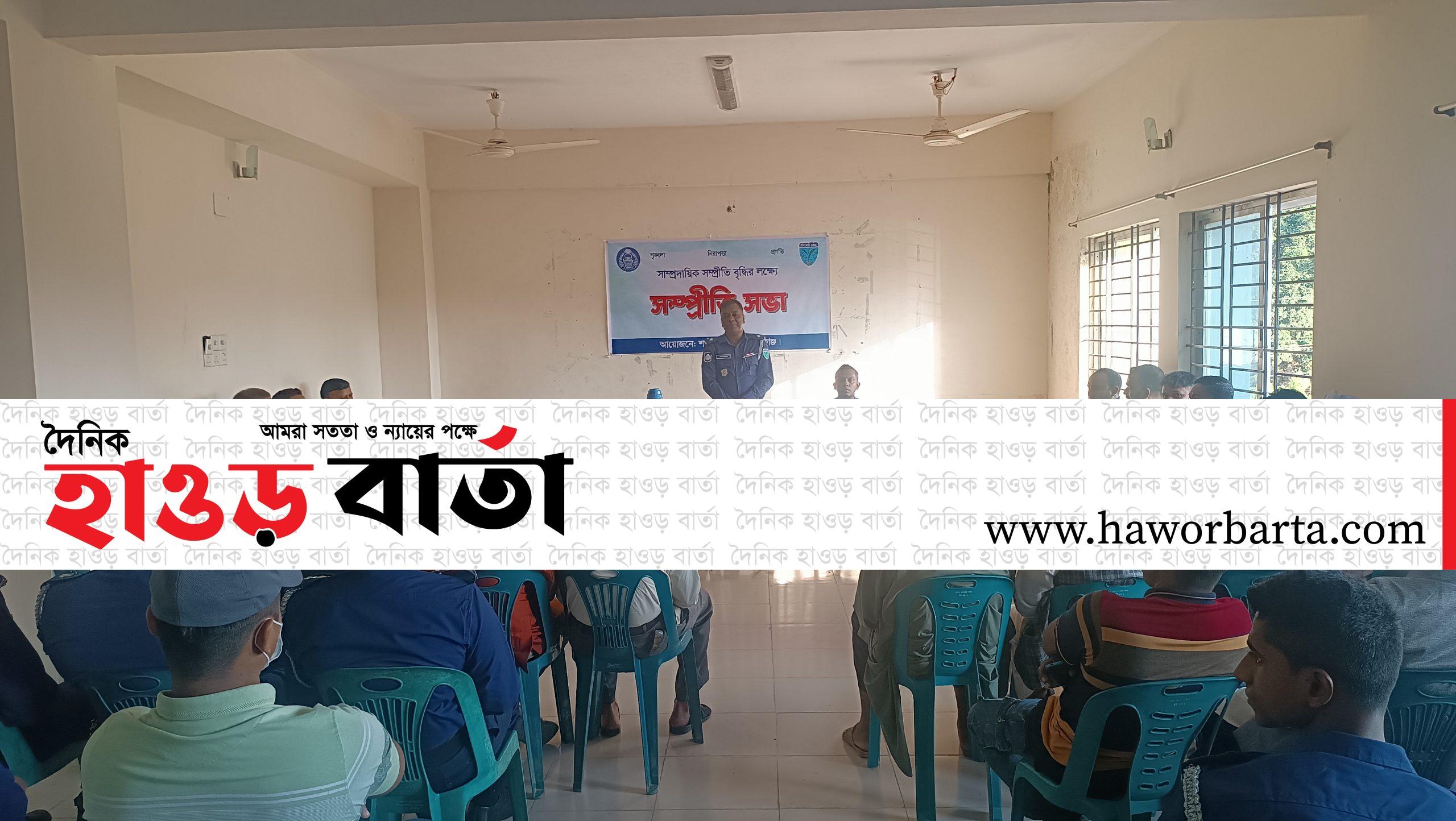 সুনামগঞ্জের শান্তিগঞ্জ থানা পুলিশের উদ্যোগে সাম্প্রদায়িক সম্প্রীতি সমাবেশ অনুষ্ঠিত হয়েছে। মঙ্গলবার বিকাল ৩ টায় শান্তিগঞ্জ থানার হলরুমে থানার অফিসার ইনচার্জ (ওসি) আক্রাম আলীর সভাপতিত্বে ও সেকেন্ড অফিসার এস আই আব্দুর রহমানের পরিচালনায় বক্তব্য রাখেন সুনামগঞ্জ জেলা সেনাবাহিনীর সিনিয়র ওয়ারেন্ট অফিসার মো: হারুন অর রশীদ, শান্তিগঞ্জ উপজেলা বিএনপির সাবেক সাধারণ সম্পাদক আমিনুর রশীদ আমিন, উপজেলা জামায়াতের আমীর হাফেজ আবু খালেদ, সেক্রেটারী দিলওয়ার হোসেন, উপজেলা বিএনপির সাবেক যুগ্ন সাধারণ সম্পাদক জিয়াউর রহমান, জমিয়তে উলামায়ে ইসলামের শান্তিগঞ্জ উপজেলা শাখার সাধারণ সম্পাদক মাওলানা আব্দুল হাই, খেলাফত মজলিশের শান্তিগঞ্জ উপজেলা শাখার নির্বাহী সভাপতি মাওলানা ছমির উদ্দিন সালেহ, উপজেলা পূঁজা উদযাপন পরিষদের সভাপতি জ্যোতিভূষন তালুকদার ঝন্টু, সাধারণ সম্পাদক সুরঞ্জিত চৌধুরী টপ্পা, সমাজ কল্যাণ সম্পাদক দিলিপ কুমার দাশ, শান্তিগঞ্জ প্রেসক্লাবের সভাপতি আবু সঈদ, সাধারণ সম্পাদক মো: নুরুল হক, পাথারিয়া ইসকন মন্দিরের পরিচালক জনার্দন দাশ ব্রক্ষ্মচারী, গণ অধিকার পরিষদের শান্তিগঞ্জ উপজেলা শাখার সদস্য সচিব ইয়াছিন আরাফাত। এ সময় শান্তিগঞ্জ থানার এস আই মিজানুর রহমান, এস আই কাজল দাশ, এস আই শফিকুল ইসলাম সহ উপজেলা বিভিন্ন রাজনৈতিক,সামাজিক ও সাংস্কৃতিক সংগঠনের নেতৃবৃন্ধ উপস্থিত ছিলেন।