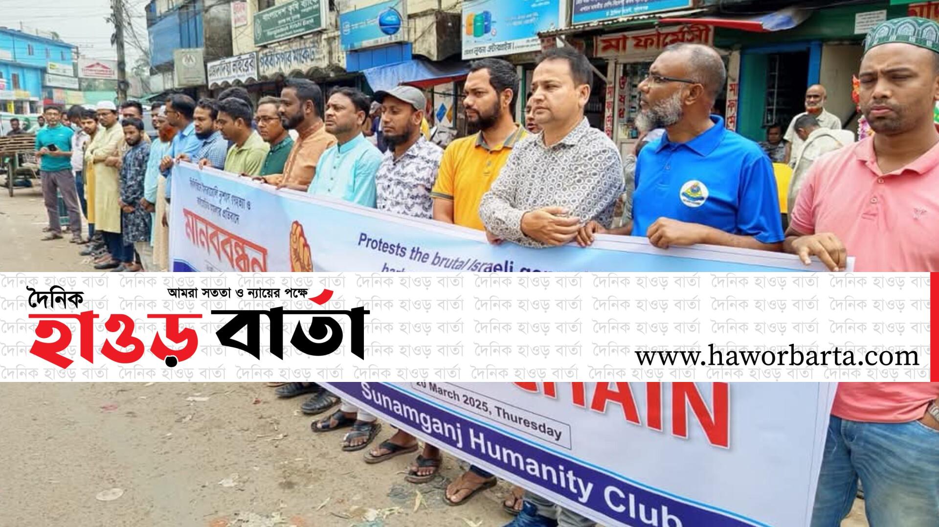 নিজেস্ব প্রতিবেদক: সুনামগঞ্জে হিউম্যানটি ক্লাবের উদ্যোগে গাজা উপত্যকায় ফিলিস্তিনি স্বাধীনতাকামী নিরপরাধ মানুষের ওপর ইসরাইলি বাহিনীর অমানবিক ও বর্বরোচিত হামলা এবং ভারতের মুসলিমদের উপর নির্যাতনের প্রতিবাদে মানববন্ধন অনুষ্ঠিত হয়েছে।