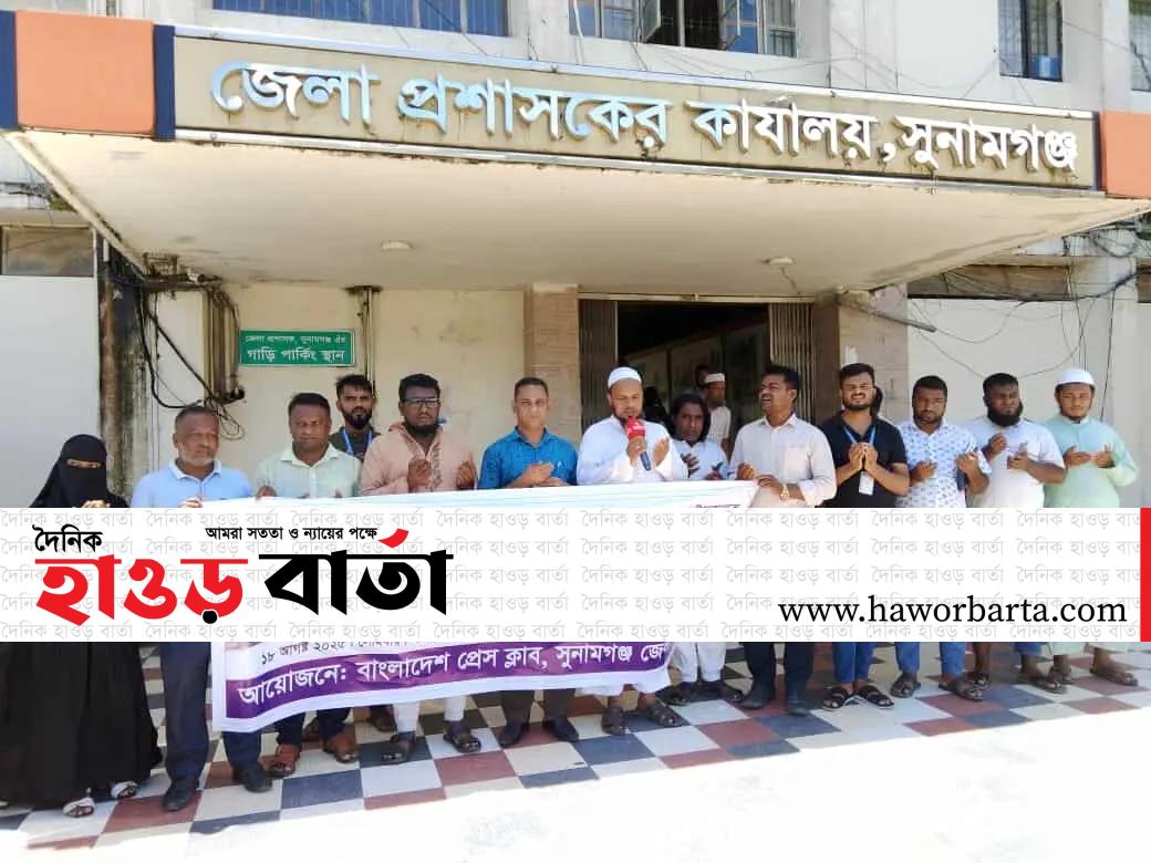 এম আর সজিব সুনামগঞ্জ: গাজীপুরে প্রকাশ্য দিবালোকে গলা কেটে সাংবাদিক আসাদুজ্জামান তুহিন কে হত্যার প্রতিবাদে বাংলাদেশ প্রেস ক্লাব সুনামগঞ্জ জেলা শাখার উদ্যোগে মানববন্ধন ও বিক্ষোভ সমাবেশ অনুষ্ঠিত হয়েছে। রবিবার (১৮ আগস্ট) বেলা ১১ টায় সুনামগঞ্জ জেলা প্রশাসকের কার্যালয়ের সামনে এই মানবন্ধন ও বিক্ষোভ কর্মসূচি অনুষ্ঠিত হয়।