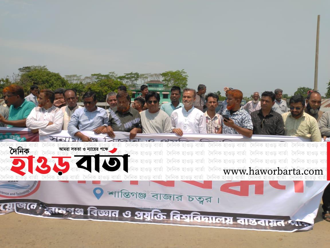 সুনামগঞ্জ বিজ্ঞান ও প্রযুক্তি বিশ্ববিদ্যালয় নির্ধারিত স্থানে দ্রুত স্থাপনের দাবীতে মানববন্ধন