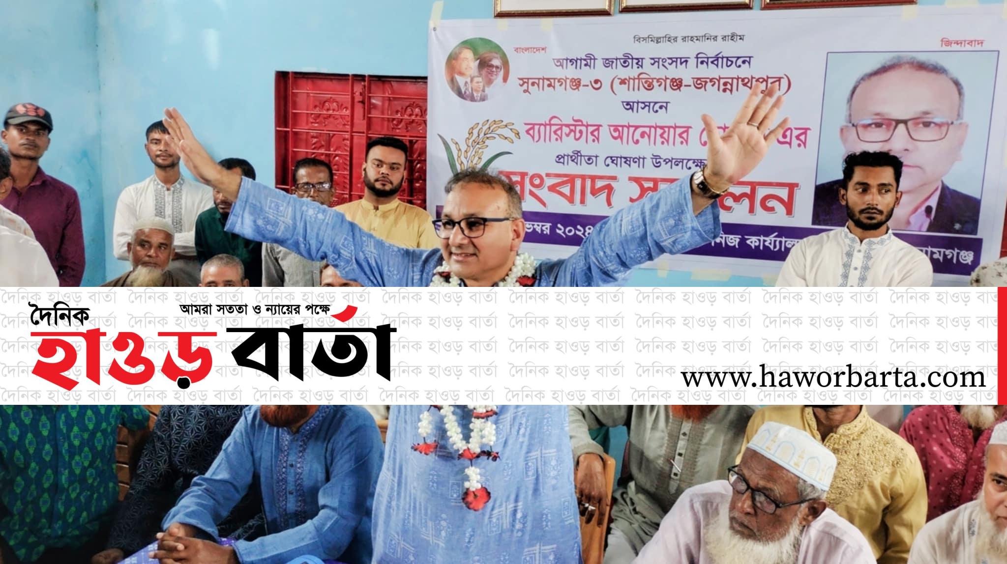 প্রার্থীতা ঘোষণাকালে সুনামগঞ্জ জেলা বিএনপির বিগত কমিটির সহসভাপতি ব্যারিষ্টার আনোয়ার হোসেন বলেন, আমি আশা করছি এবং সবিনয় অনুরোধ করছি যে, আমার নেত্রী ও দেশনেত্রী বেগম খালেদা জিয়া এবং ভারপ্রাপ্ত চেয়ারম্যান আগামী দিনের রাষ্ট্রনায়ক তারেক রহমান ধানের শীষ তথা বিএনপির একজন প্রার্থী হিসেবে আমাকে সক্রিয় বিবেচনার দৃষ্টিতে দেখবেন।