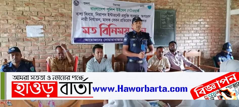 সুনামগঞ্জের দোয়ারাবাজারে বাংলাদেশ পুলিশ উইমেন নেটওয়ার্কের মতবিনিময় সভা অনুষ্ঠিত হয়েছে। সোমবার দুপুরে উপজেলা সদরের মহিবুর রহমান মানিক বালিকা বিদ্যালয়ে বিদ্যালয়ে দোয়ারাবাজার থানা পুলিশের উদ্যোগে এ মতবিনিময় সভা অনুষ্ঠিত হয়।