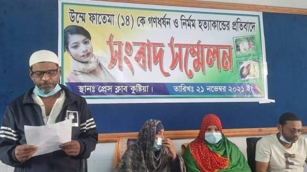 কুষ্টিয়া জেলা প্রতিনিধি। কুষ্টিয়ার মিরপুর বর্ডার গার্ড পাবলিক স্কুল এন্ড কলেজের নবম শ্রেণীর ছাত্রী উম্মে ফাতেমার (১৪) গণধর্ষণ ও নৃশংস হত্যাকান্ডের সুষ্ঠু তদন্ত ও বিচারের দাবিতে সংবাদ সম্মেলন করেছেন নিহতের