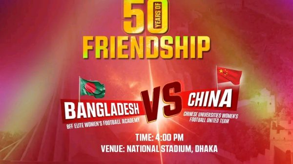 ঢাকা: ৫০ বছরের আন্তর্জাতিক বন্ধুত্বের স্মরণে বাংলাদেশের নারী ফুটবল একাডেমি এবং চীনের বিশ্ববিদ্যালয় মহিলা ফুটবল দল মুখোমুখি হচ্ছে। এই বিশেষ বন্ধুত্ব ম্যাচ অনুষ্ঠিত হবে আজ বিকাল ৪টায় জাতীয় স্টেডিয়ামে, ঢাকা।