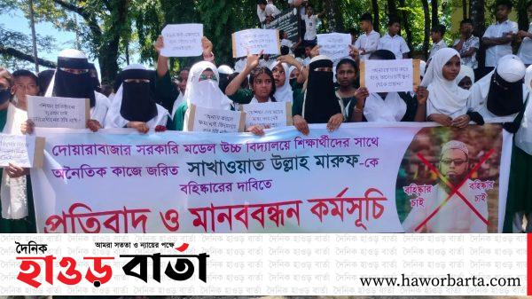 দোয়ারাবাজার (সুনামগঞ্জ) সংবাদদাতা: সুনামগঞ্জের দোয়ারাবাজার উপজেলার সরকারি মডেল উচ্চ বিদ্যালয়ের সহকারী শিক্ষক সাখাওয়াত উল্যাহ মারুফের বিরুদ্ধে শিক্ষার্থীদের সঙ্গে অনৈতিক আচরণের অভিযোগ উঠেছে। এ ঘটনায় তার বহিষ্কারের দাবিতে শিক্ষার্থীরা বিক্ষোভ ও